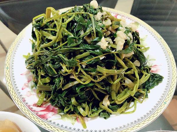 Rau muống xào đơn giản nhưng rất mướt mắt, còn nguyên màu xanh đạt thẩm mỹ.