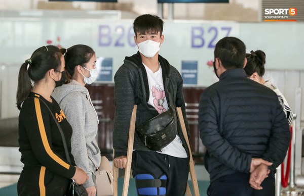 Trước khi được di chuyển bằng xe lăn do hãng bay chuẩn bị, Duy Mạnh vẫn dùng nạng đi lại.