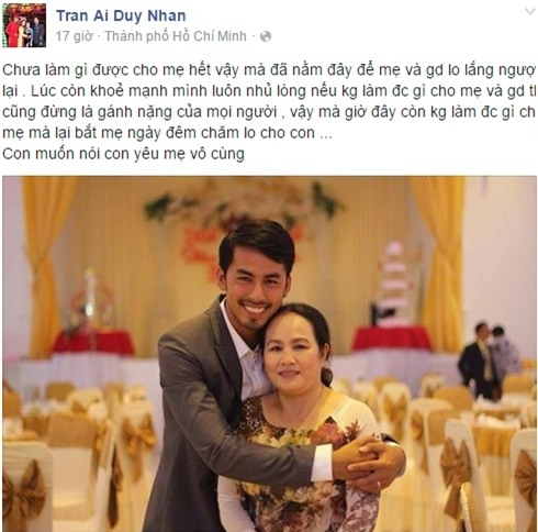 Trên trang cá nhân, Duy Nhân từng viết: "Chưa làm gì được cho mẹ hết vậy mà đã nằm đây để mẹ và gia đình lo lắng ngược lại.