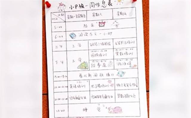Với người mẹ này, việc ép con học chăm chỉ mỗi ngày là cách hay để họ không tụt lại phía sau so với bạn bè cùng trang lứa. Mỗi chương trình học trong thời gian biểu của con trai đều được tính toán, lên kế hoạch cẩn thận. Hiện tại, cậu bé theo học các lớp ngoại khóa, bao gồm piano, thư pháp, bơi, văn cổ, võ đạo, khiêu vũ, tiếng Anh và Toán.