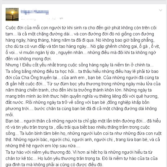Ta sống bằng những điều ta học hỏi... ta thấu hiểu những điều hay lẽ phải từ bao đời của Cha Ông truyền lại... của anh em , bạn bè. Của những người đã cùng ta đi gần hết cuộc đời... Từ sự đùm bọc yêu thương trong những ngày máu lửa của năm tháng chiến tranh, cho đến khi ta trưởng thành khôn lớn. Những ngày ta mang trên mình áo lính thực hiện quyền nghĩa vụ thiêng liêng đối với quê hương, đất nước. Rồi những ngày ta trở về sống với bạn bè ,đồng nghiệp khắp bốn phương trời.... bước chân ta cùng bạn bè đã đi cả một chặng đường dài không mỏi.