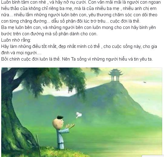 Luôn bình tâm con nhé và hãy nở nụ cười. Con vẫn mãi mãi là người con ngoan hiếu thảo của không chỉ riêng ba mẹ, mà là của nhiều ba mẹ , nhiều anh chị em nữa... nhiều lắm những người luôn bên con, yêu thương chăm sóc con dõi theo con từng chặng đường... dẫu số phận đôi lúc trớ trêu... cuộc đời là thế.