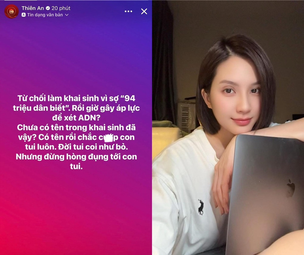 Người đẹp cũng phản pháo căng đét: "Từ chối làm khai sinh vì sợ 94 triệu dân biết. Rồi giờ gây áp lực để xét ADN? Chưa có tên trong khai sinh đã vậy? Có tên rồi chắc cướp con tui luôn. Đời tui coi như bỏ. Nhưng đừng hòng đụng tới con tui".