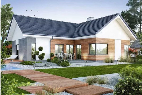 Đây là mẫu nhà cấp 4 mái lệch với những đường nét vô cùng tinh tế. Sử dụng gam màu trắng chủ đạo, hệ thống cửa sổ, cửa chính khung màu đen tạo ra những hình khối là điểm nhấn cho mặt tiền nhà