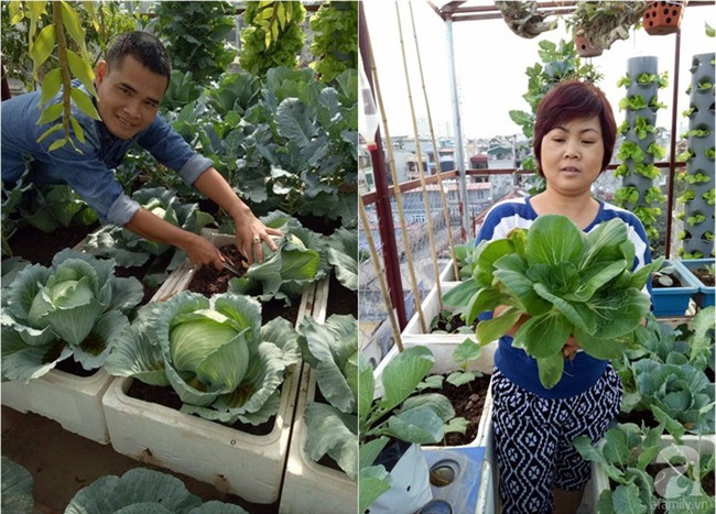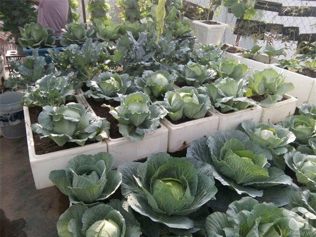 Vợ chồng anh Hùng trồng bắp cải cả trong thùng xốp và chậu nhựa thông minh.