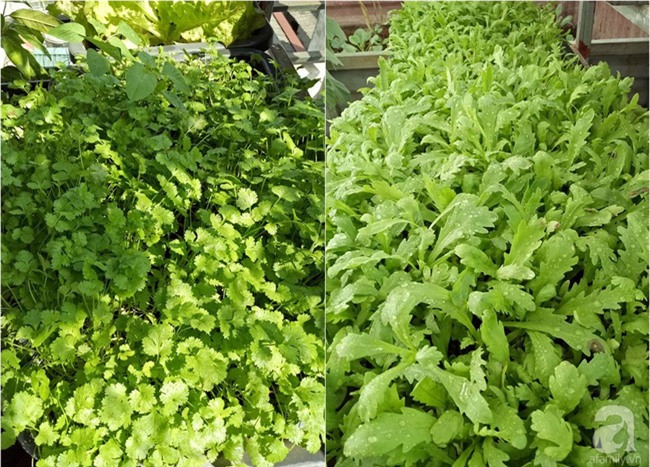 Rau mùi và cải cúc tươi tốt nhờ bàn tay chăm bón của anh Hùng.