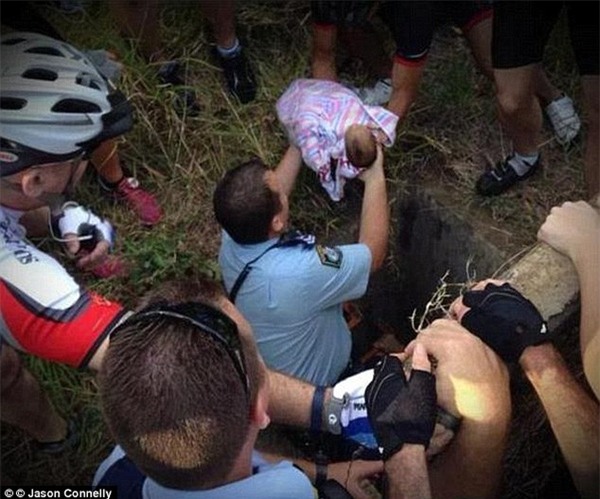 lật nắp cống bằng bê tông nặng hơn 200kg để đưa em bé ra ngoài.