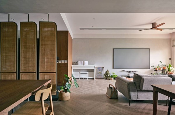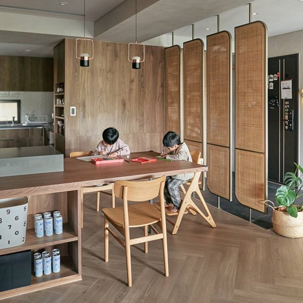 Bước vào nhà là hệ thống cửa, tủ gỗ tông màu trầm. Tủ giày kịch sàn vừa sạch sẽ lại lưu trữ được đồ đạc rất lớn. Tấm cửa đẩy kiểu Nhật mây tre có thể dễ dàng di chuyển, tháo lắp vệ sinh theo mong muốn.