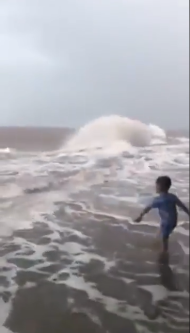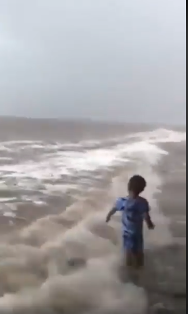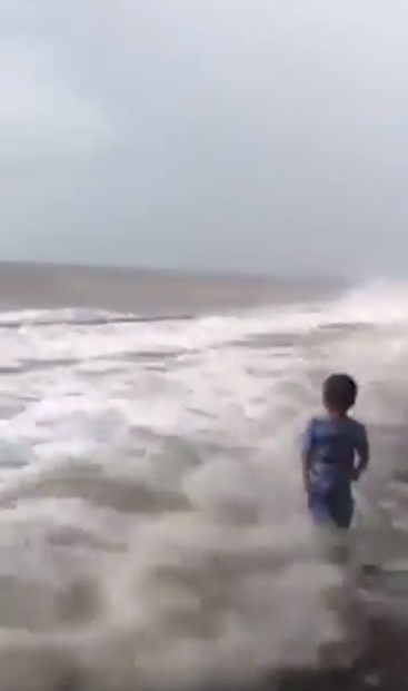 Cậu bé chừng 4 - 5 tuổi thản nhiên đùa nghịch bên con sóng dữ. Ảnh cắt từ clip