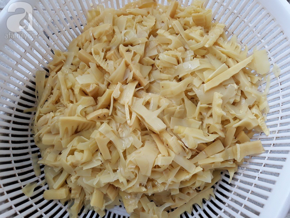 Măng chua rửa thật sạch cho bớt chua, tiếp theo cho vào nồi nước luộc sôi sau đó thả vào bát nước lọc, cuối cùng đổ ra rổ cho ráo nước.