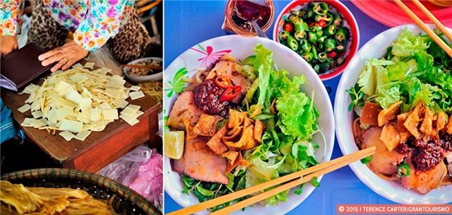 Từng miếng bánh tráng phơi sương xắt sợi, trộn chung với xoài xanh, khô bò, trứng cút, rau răm... Tất cả hòa quyện tạo nên một hương vị phong phú, đậm đà của món bánh tráng trộn.