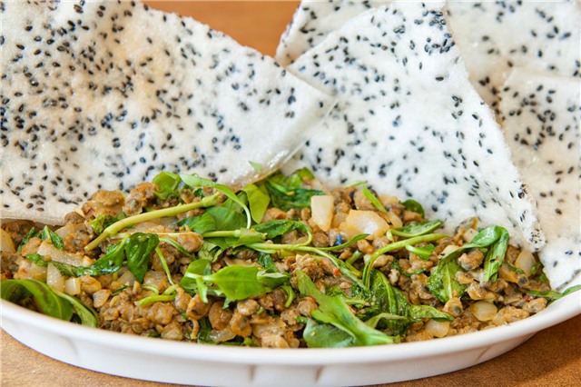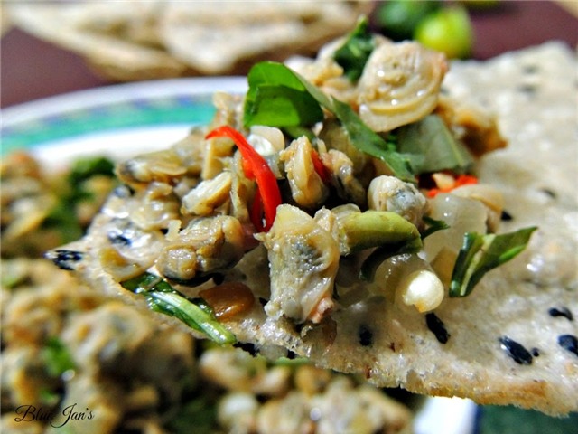 Hến được trộn với hành lá, rau thơm Trà Quế, ớt hiểm xắt mỏng, kèm theo hành phi và đậu phộng rang.