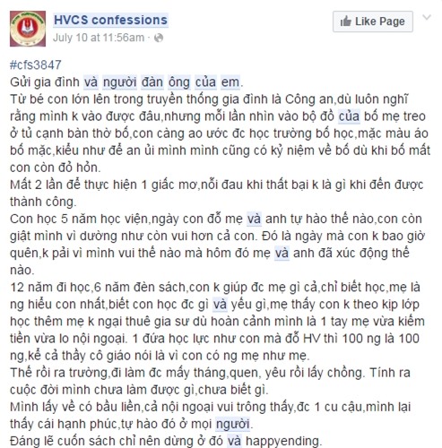 Những dòng tâm sự của chị Đậu Thị Huyền Trâm được chia sẻ trên confession của Học viện cảnh sát. |
