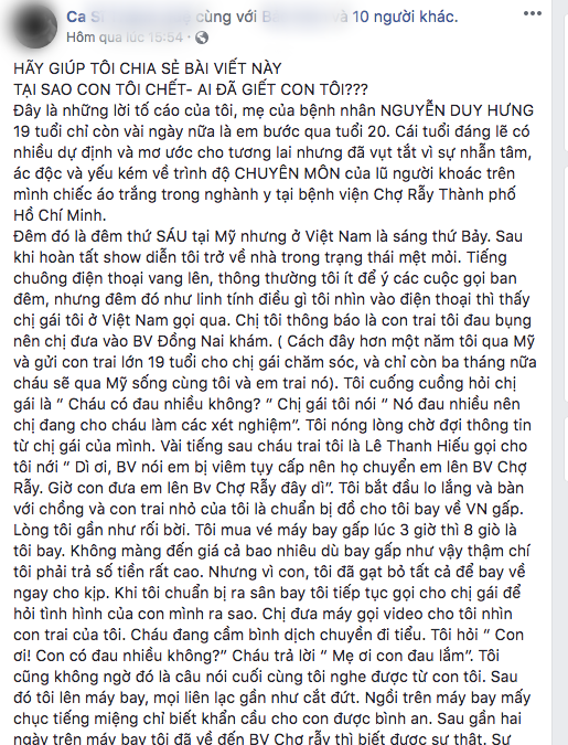 Theo người mẹ tên Ly, bà đang sống tại Mỹ và gửi con trai 19 tuổi cho chị gái nuôi dưỡng tại Việt Nam. Sau khi phát bệnh và nhập viện cấp cứu tại bệnh viện Chợ Rẫy (TP. HCM), con bà đã tử vong và bà cho rằng nguyên nhân là do sự tắc trách của các y bác sĩ tại đây.