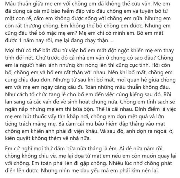 Vừa thương mẹ nhưng vẫn yêu chồng, cô gái không biết cách giải quyết ra sao cho thỏa đáng: "Mâu thuẫn giữa mẹ em với chồng em đã không thể cứu vãn. Mẹ em đã dùng cả cái mũ bảo hiểm đập vào đầu chồng em và tuyên bố từ mặt con rể, cấm em không được sống với chồng em nữa. Nhưng em còn rất thương chồng. Em không thể bỏ chồng em được. Nhưng em cũng đâu thể bỏ mặc mẹ em? Mẹ em chỉ có mình em. Bố em mất được 1 năm nay rồi, mẹ lại đang chạy thận…