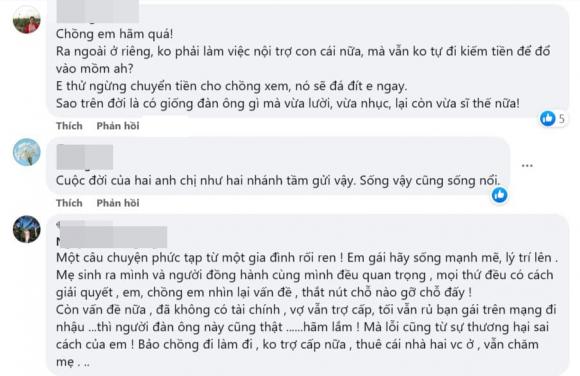 Đọc xong câu chuyện của người vợ, cư dân mạng cho rằng 2 vợ chồng này sống quá phụ thuộc vào mẹ vợ nên mới xảy ra nhiều vấn đề: "Cuộc đời của hai anh chị như hai nhánh tầm gửi vậy. Sống vậy cũng sống nổi", "Chồng em hãm quá! Ra ngoài ở riêng, không phải làm việc nội trợ con cái nữa, mà vẫn không tự đi kiếm tiền để đổ vào mồm à? Em thử ngừng chuyển tiền cho chồng xem, nó sẽ đá đít em ngay", "Ô nhà này lạ thật vợ thì vô dạng, chồng thì vô dụng như 2 cây tầm gửi vào thân già mà cũng sống kiểu đó được nhỉ. Giờ không gửi tiền cho thằng chồng vô dụng này nữa xem nó có gọi điện kêu nhớ thương vợ không"...