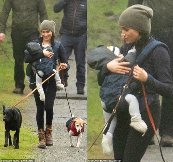 Meghan Markle diện đồ năng động, bế con trai 8 tháng tuổi trước ngực. Hai tay cô giữ hai con chú chó cưng. Gương mặt vợ Hoàng tử Harry tươi cười vui vẻ khi bắt gặp ống kính. Chuyến đi này còn có một số vệ sĩ hộ tống Markle.