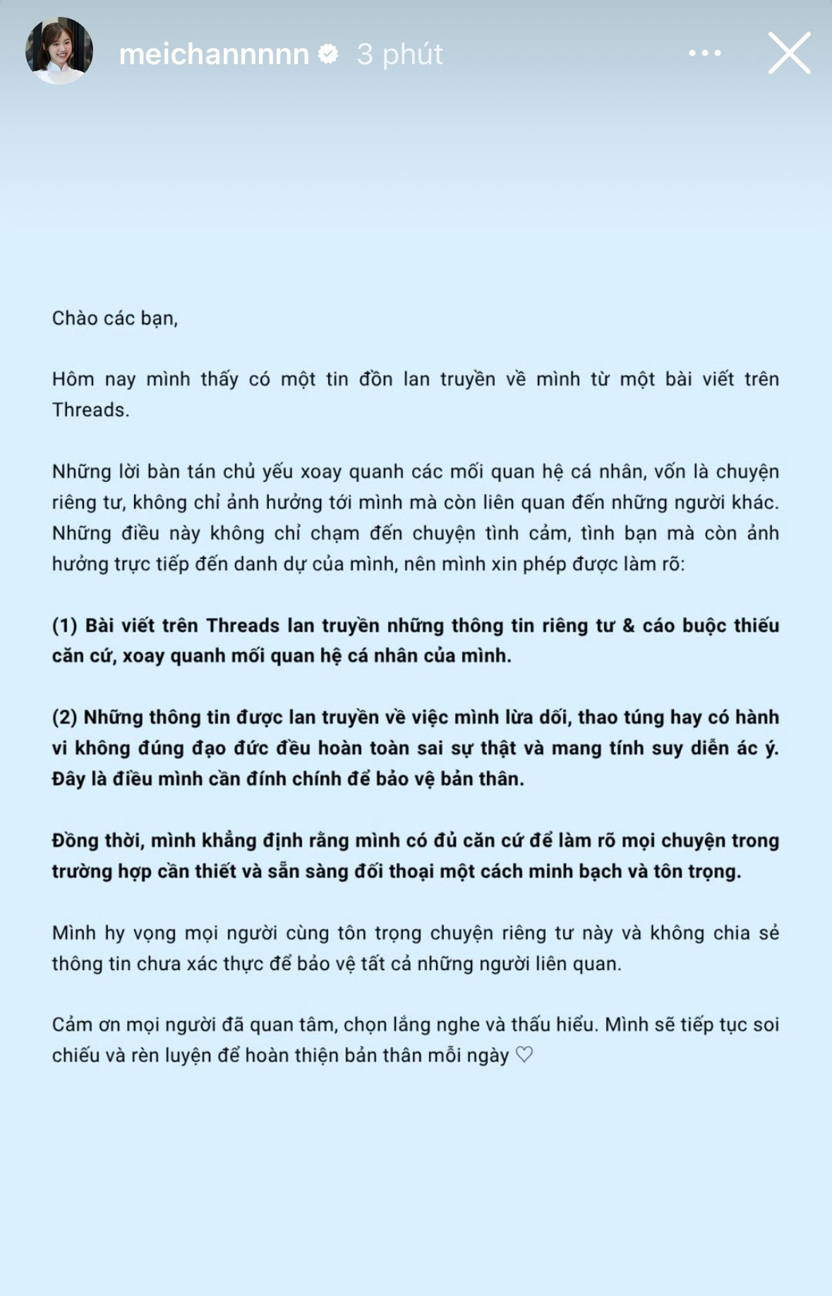 “Những thông tin được lan truyền về việc mình lừa dối, thao túng hay có hành vi không đúng đạo đức đều hoàn toàn sai sự thật và mang tính suy diễn ác ý. Đây là điều mình cần đính chính để bảo vệ bản thân.