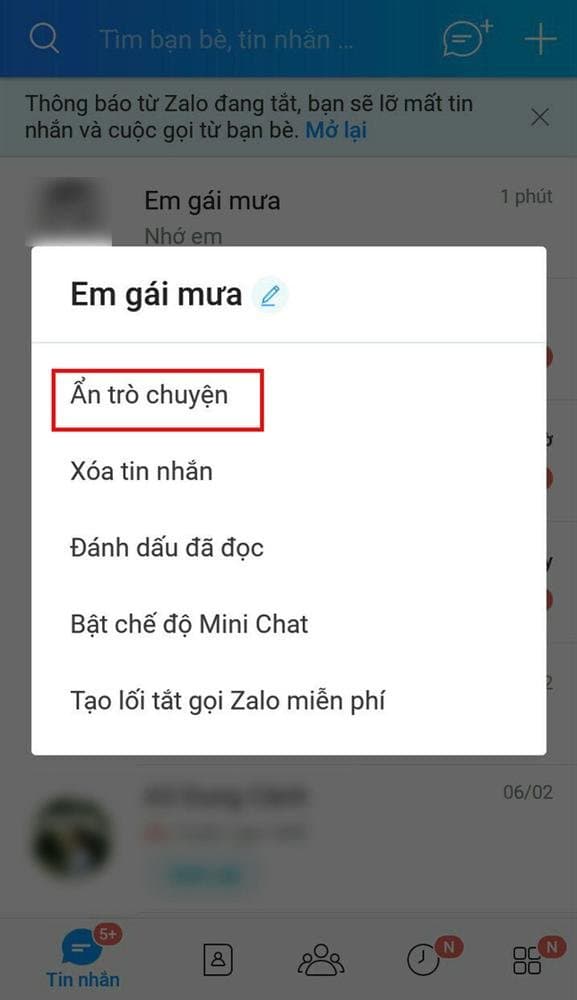 Bước 2: Bảng thông báo hiện ra, chọn 'Ẩn trò chuyện'.
