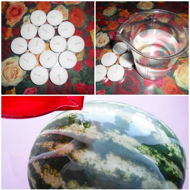 - Lau sạch dưa hấu với một miếng vải khô (không cần phải rửa). - Đun chảy dầu parafin hoặc sáp rồi đổ chúng vào một ca đựng nước. Bạn cũng có thể sử dụng nến thay thế nhưng nhớ phải loại bỏ phần dây bấc và phân chia chúng thành các miếng nhỏ trước khi đun chảy. - Để dung dịch đun chảy nguội bớt nhưng vẫn ở dạng lỏng, sau đó đổ đều dung dịch này lên bao phủ toàn bộ bề mặt của quả dưa hấu một lớp dày khoảng 0,5 cm. - Để cho dầu parafin / sáp/ nến nguội và cứng lại.