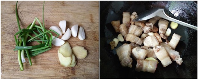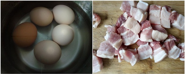 Trứng luộc chín sau đó thả vào nước lạnh rồi bóc vỏ. Thịt ba chỉ heo cắt khúc vừa ăn. Bạn nên chọn thịt có màu hồng nhạt, tươi, ngon và có tỉ lệ mỡ - nạc cân bằng.