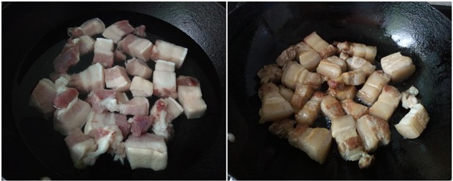 Bắc nồi nước lên bếp luộc sơ qua thịt ba chỉ, sau đó vớt ra để ráo. Tiếp đến, bạn cho thịt vào chảo, để ở lửa nhỏ, lúc này phần mỡ từ thịt sẽ tự chảy ra. Nấu cho đến khi thịt cháy cạnh hai mặt hấp dẫn.