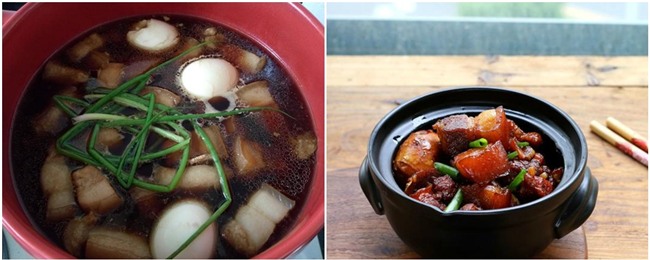 Cuối cùng cho rượu nấu ăn, nước tương, nước mắm, muối, đường, hành, trứng và nước vào. Sau khi hỗn hợp sôi thì hạ nhỏ lửa, đun trong 1 giờ - khi nước sốt quyện đặc vào thịt là món ăn hoàn thành!