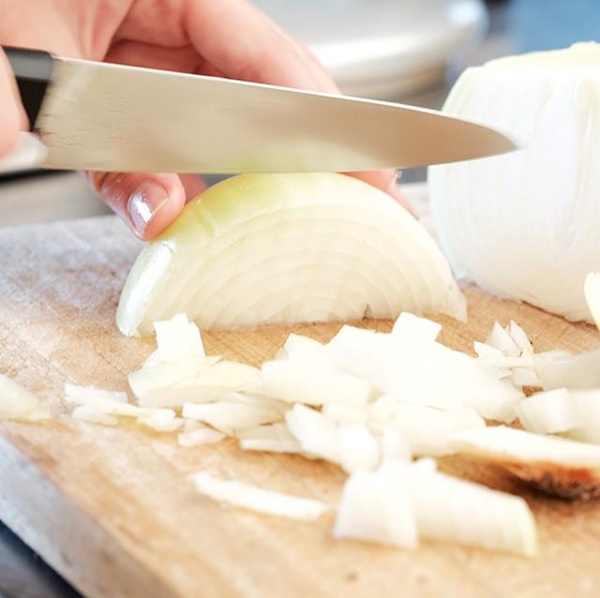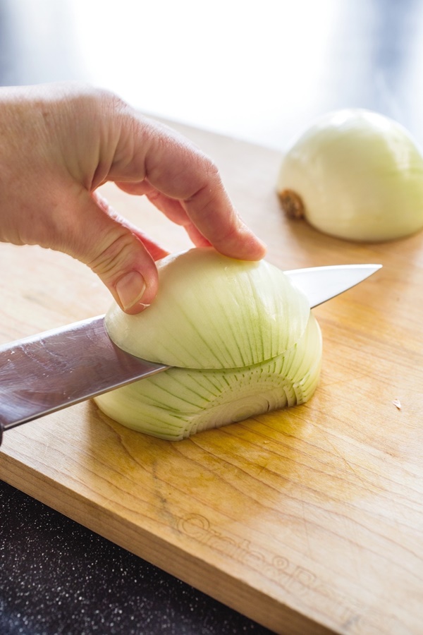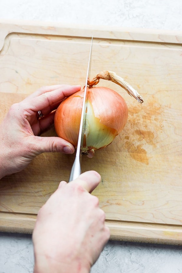 Bước 1: Sau khi lột vỏ và rửa sạch bạn cắt đôi củ hành nhưng không bỏ phần gốc.