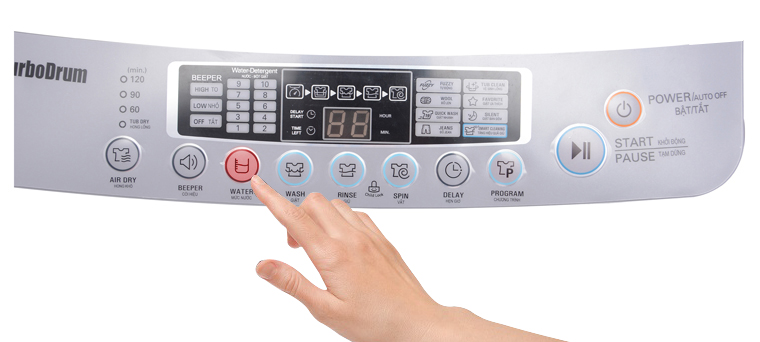 Chọn mực nước phù hợp không những tiết kiệm nước mà máy giặt còn được giảm bớt thời gian hoạt động. Nếu lượng đồ ít và mỏng nhẹ, bạn chỉ nên sử dụng mực nước thấp. Còn đối với lượng quần áo nhiều hơn, bạn có thể đặt mức nước cao để đảm bảo áo quần được sạch sẽ hoàn toàn sau khi giặt.
