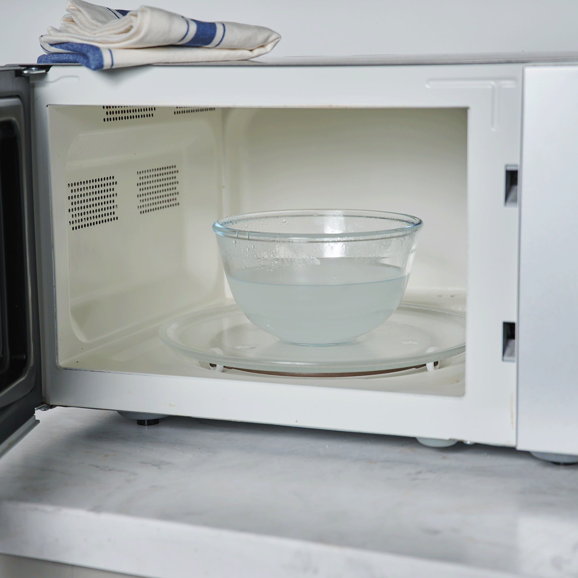 Sử dụng giấm trắng để làm sạch lò vi sóng là một mẹo hay mà tất cả các chị em đều cần biết tới. Cách thực hiện vô cùng đơn giản khi bạn chỉ cần đổ vào 1 bát sạch giấm và nước với tỉ lệ 50:50. Sau đó, cho bát đựng hỗn hợp vào lò vi sóng và làm nóng trong vòng 5 phút. Tận dụng khi hơi ẩm còn bám xung quanh lò vi sóng, bạn chỉ cần dùng một miếng khăn ẩm lau sạch là mọi vết bẩn đều sẽ biến đi hết.