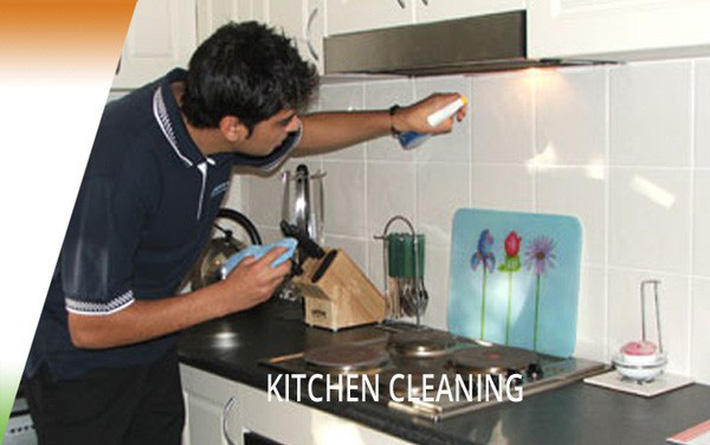 Để làm sạch tủ bếp, bạn trộn 1 phần dầu thực vật, 2 phần baking soda sau đó cho dung dịch này lên tủ bếp, và dùng bọt biển hoặc bàn chải đánh răng để chà. Sau đó dùng nước ấm và khăn mềm lau lại.