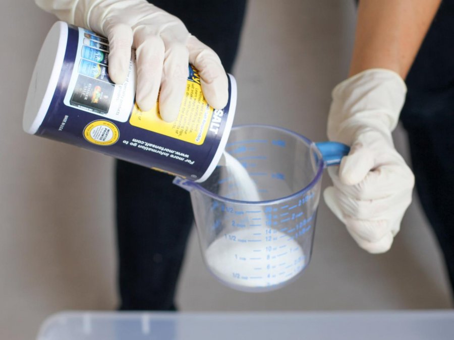 - Bước 1: Cho lượng muối thích hợp vào bồn và chà lên toàn bộ bề mặt chậu rửa bát. Muối có tác dụng mài mòn và khử khuẩn.