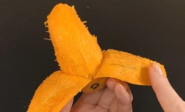 Bước thứ 3, cuối cùng bạn chỉ cần dùng tay bóc nhẹ vỏ xoài, dễ dàng và tiện lợi như bóc một quả chuối, bạn thấy cùi và vỏ tách rời hoàn toàn, không còn cùi nữa. Mẹo hay này rất thực tế phải không nào?