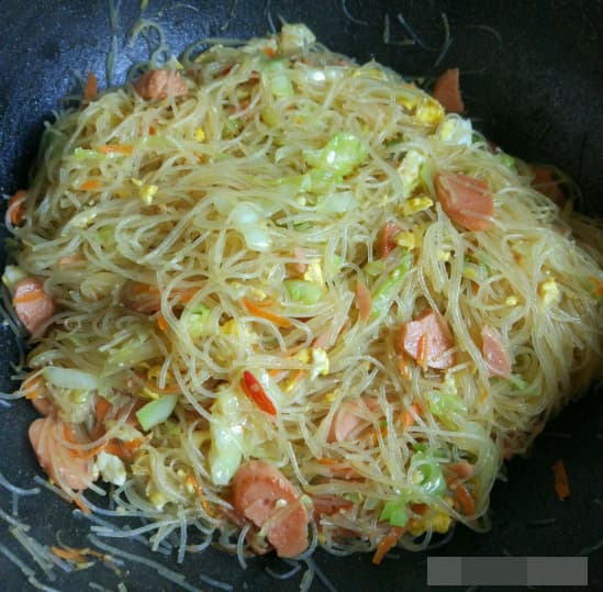 Khi gần chín cho trứng vào xào cùng, lúc này bạn cho gia vị vào, nêm muối vừa ăn, nước tương nhạt, sau khi điều chỉnh khẩu vị vừa là có thể dọn ra đĩa. Miến xào theo cách này sẽ không bị vón cục và mùi vị rất ngon. Khi chúng ta xào miến, bước quan trọng nhất là không cho miến trực tiếp vào chảo xào sau khi chần, mà nên cho một ít giấm vào nước lạnh sau đó mới vớt ra xào.