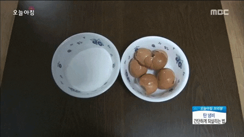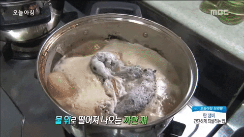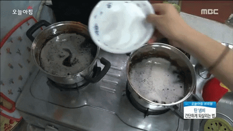 Bạn đun hai chiếc nồi cho đến khi nước sôi sùng sục. Trong lúc đun bạn sẽ thấy các vết cháy đen trong nồi có vỏ trứng bị bong ra và nổi lên trên mặt nước.