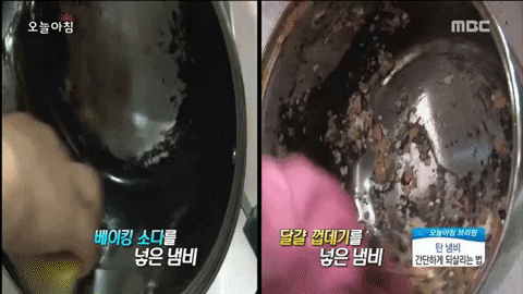 Ở đây có hai chiếc nồi cháy đen giống nhau cùng hai nguyên liệu là baking soda và vỏ trứng.