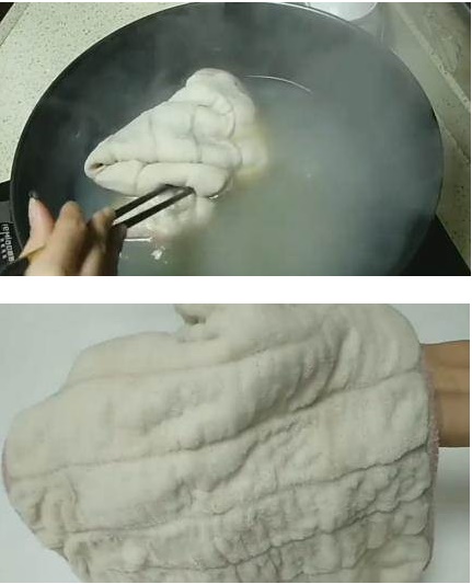 Sau đó, bạn dùng đũa khuấy qua lại và nấu trong 5 phút. Muối ăn có tác dụng tẩy dầu mỡ rất tốt, có thể tẩy vết dầu hiệu quả. Nước nóng sẽ giúp khả năng khử trùng của muối ăn mạnh hơn. Sau khi đun sôi 5 phút, bạn có thể thấy nước đã trở nên rất bẩn, tất cả đều là chất bẩn trên giẻ.