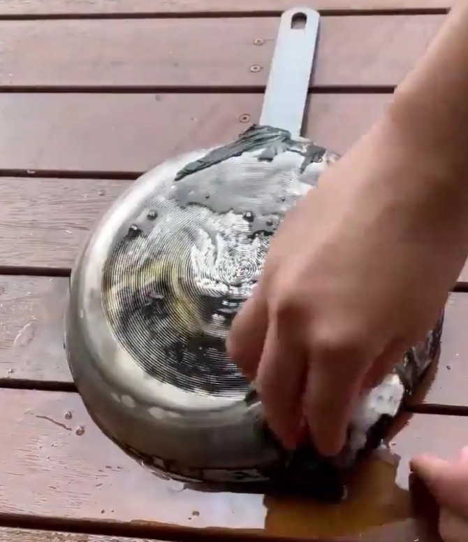 Chỉ cần cọ nhẹ nhàng thôi là chảo đã sáng bóng.