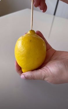 Bạn dùng một chiếc xiên gỗ (dụng cụ xiên thịt nướng) có đầu nhọn và đâm vào mặt không có cuống của quả chanh để tạo một lỗ nhỏ. Kết quả là bạn có thể dễ dàng lấy được số nước chanh tùy ý mà không bị lẫn hạt, không có lộn xộn, cũng không phải nhìn cảnh nửa quả chanh con lại héo mòn rồi hỏng khi bị bỏ quên.