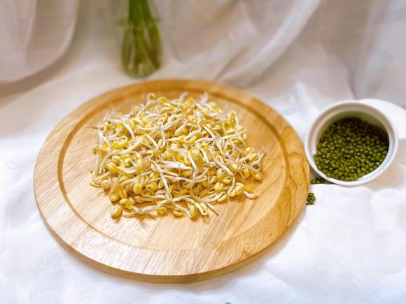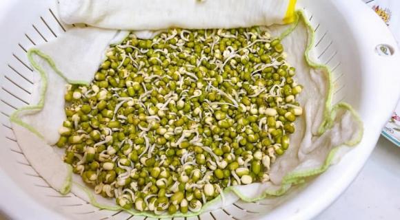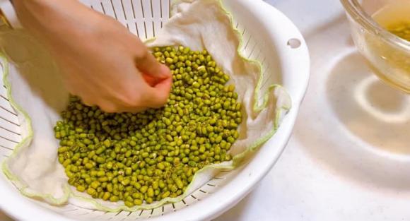 - Đặt rổ lên một cái thau. Sau đó đặt khăn ướt vào rổ. Tiếp tục cho đậu xanh trên khăn ướt rồi tán đều ra.