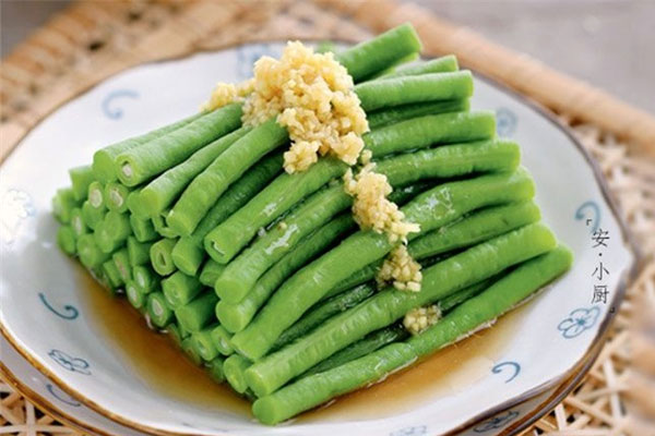 Bước 1: Trước tiên bạn cần phải làm sạch đậu, rồi bạn cho một lượng nước thích hợp vào nồi, thêm một chút muối và đun sôi vừa phải. Tiếp sau đó, bạn hãy cho đậu vào luộc trong khoảng 3 phút. Sau đó, vớt đậu ra, ngâm vào bát nước đun sôi để nguội để đậu giữ được màu xanh và độ giòn.