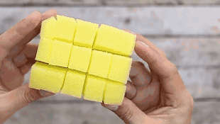 Cách làm: Cắt miếng bọt biển thành các đường dọc đều nhau, sau đó cắt tiếp vài đường theo chiều ngang sao cho tạo thành các múi nhỏ mà không bị đứt rời ra.