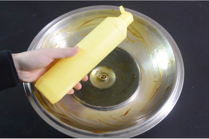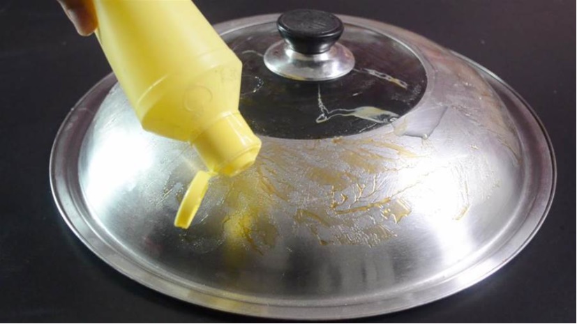 Đầu tiên, nhỏ một ít nước rửa chén vào bên trong và bên ngoài nắp nồi.