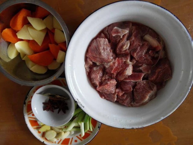 Sơ chế nguyên liệu: Rửa sạch thịt bắp bò, cắt miếng và để ráo nước. Chuẩn bị khoai tây, cà rốt, hành tây và gừng tỏi theo hướng dẫn.