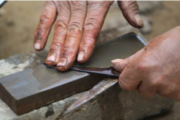 khi mài dao, tốt nhất bạn nên ngâm dao trong nước muối 20 phút rồi mài trên đá mài. Sau đó, vừa đổ nước muối vừa mài để dao nhanh sắc hơn và kéo dài tuổi thọ.