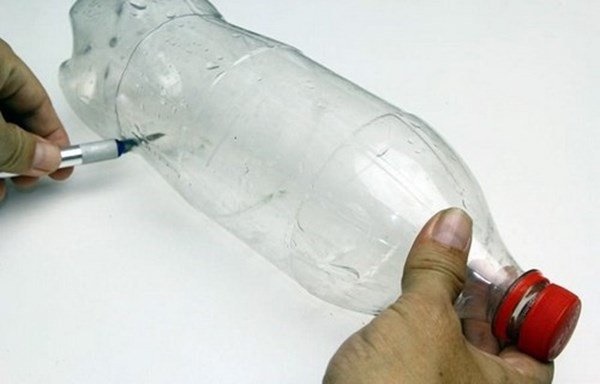 Dùng dao hoặc kéo cắt phần đáy chai đi giữ lại phần đầu chai và nắp. Phần bị cắt đi chiếm tầm 1/3 chai đối với chai dạng 1,5 lít như coca cola, các chai nước ngọt. Sau đó bạn hãy khéo léo đục tầm 3, 4 lỗ phần gần nắp chai. Những lỗ này không được quá to tầm 5mm đường kính là được. Vì nếu quá to giá thể rất dễ bị vương vãi ra ngoài. Các lỗ này có chức năng giúp thoát hơi nước cho rễ tạo độ thoáng khí để cây rau phát triển.