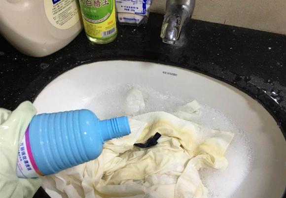 2. Đổ một lượng thích hợp bột giặt, giấm trắng, nước tẩy trắng, thêm một ít muối và khuấy đều.
