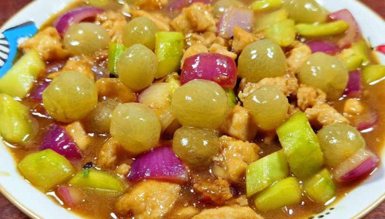 Thịt gà chín mềm thơm, đậm vị ăn cực kỳ ngon. Nho chua chua ngọt ngọt kích thích vị giác giúp món ăn độc đáo hơn.