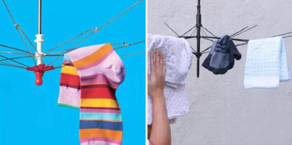 Ở phương án này, bạn cần tháo bỏ tấm vải dù của ô và để lại phần sườn ô và giá đỡ ô. Sau đó, bạn có thể gắn chúng lên dây phơi để làm khô các vật dụng nhỏ như đồ lót hoặc tất như trong hình rất tiện dụng.
