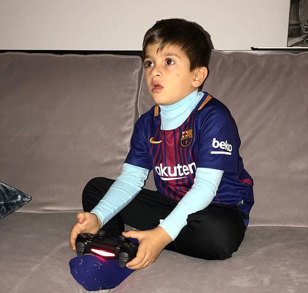 Biểu cảm đáng yêu của Thiago khi chơi game bóng đá với bố.